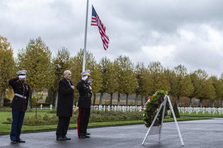 Chairman of the Joint Chiefs of Staff Gen. Joseph Dunford and White House Chief of Staff John Kelly laid a floral wreath during their visit to Aisne-Marne American Cemetery on November 10