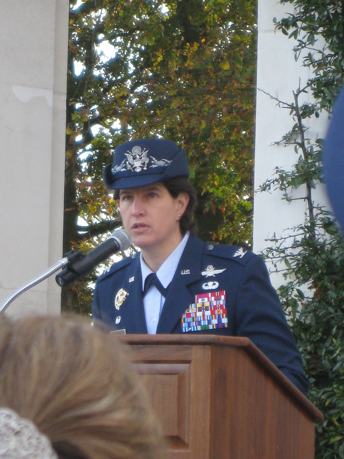 Col. Angela M. Cadwell delivered the welcoming remarks during the 2014 Veterans Day Ceremony at Cambridge American Cemetery.