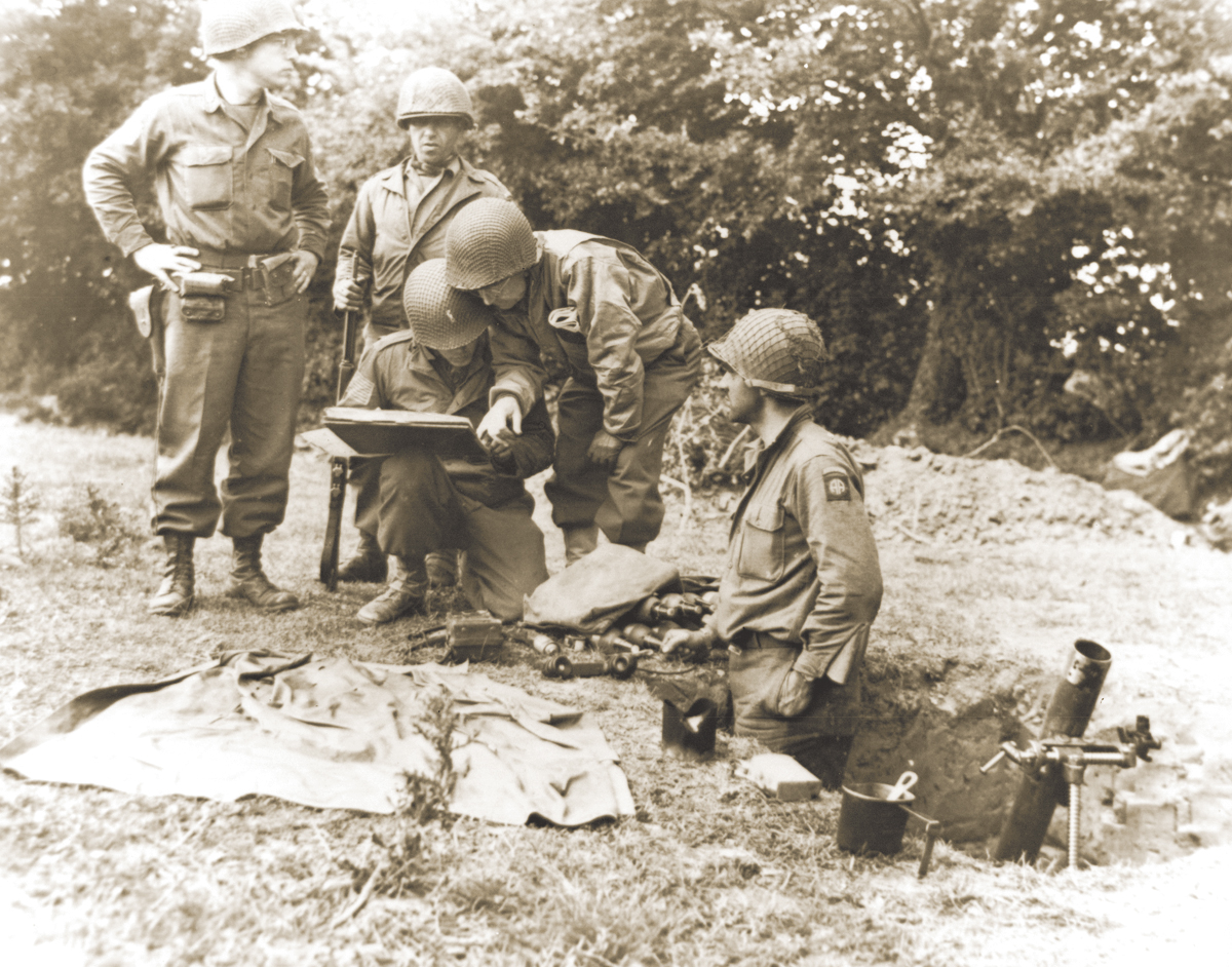 Colonel confers with an 81mm mortar crew, June 8, 1944.