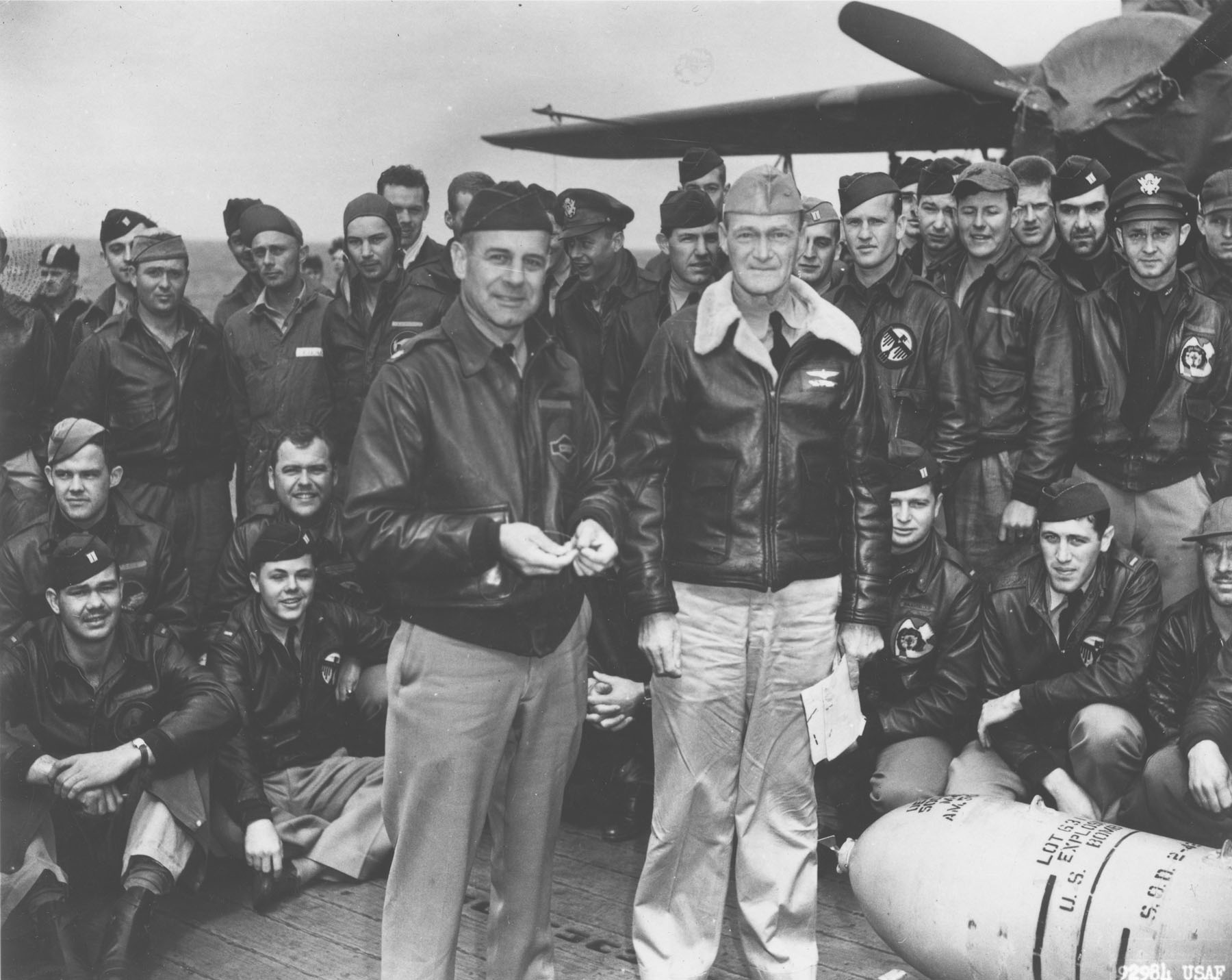 Doolittle, Mitscher, and many other service members stand on deck in historic photo.