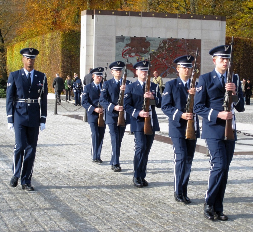 A firing detail participates in the 2012 Veterans Day Ceremony at Luxembourg American Cemetery.