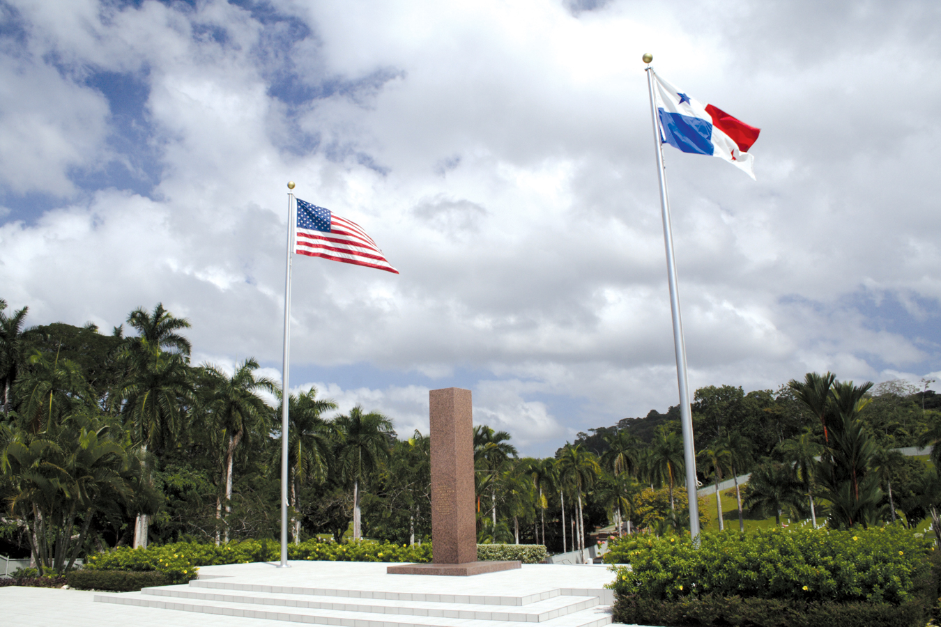 Flags and obelisk at the memorial plaza at Corozal American Cemetery.