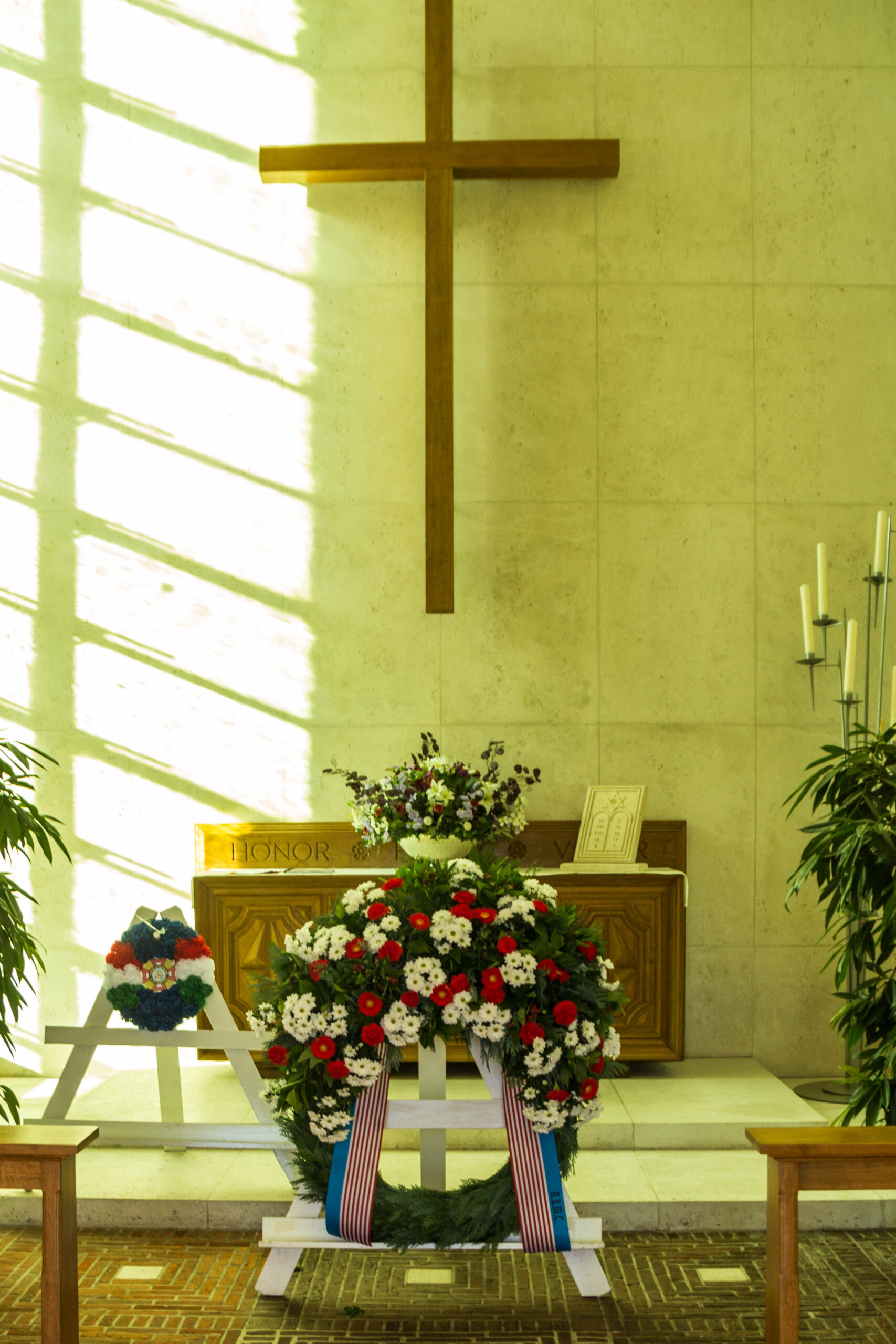 Wreaths from the 2013 Veterans Day Ceremony at Netherlands American Cemetery are placed in the chapel after the ceremony.