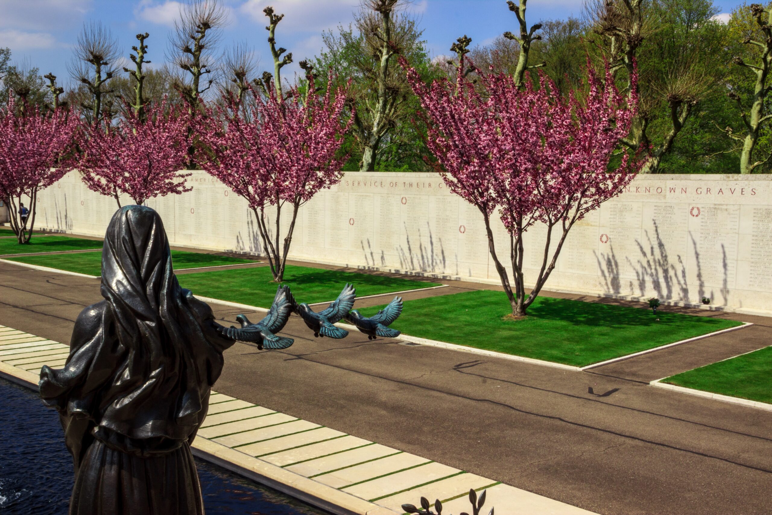 Flowering cherry trees, walls of the missing and the mourning woman statue at Netherlands American Cemetery