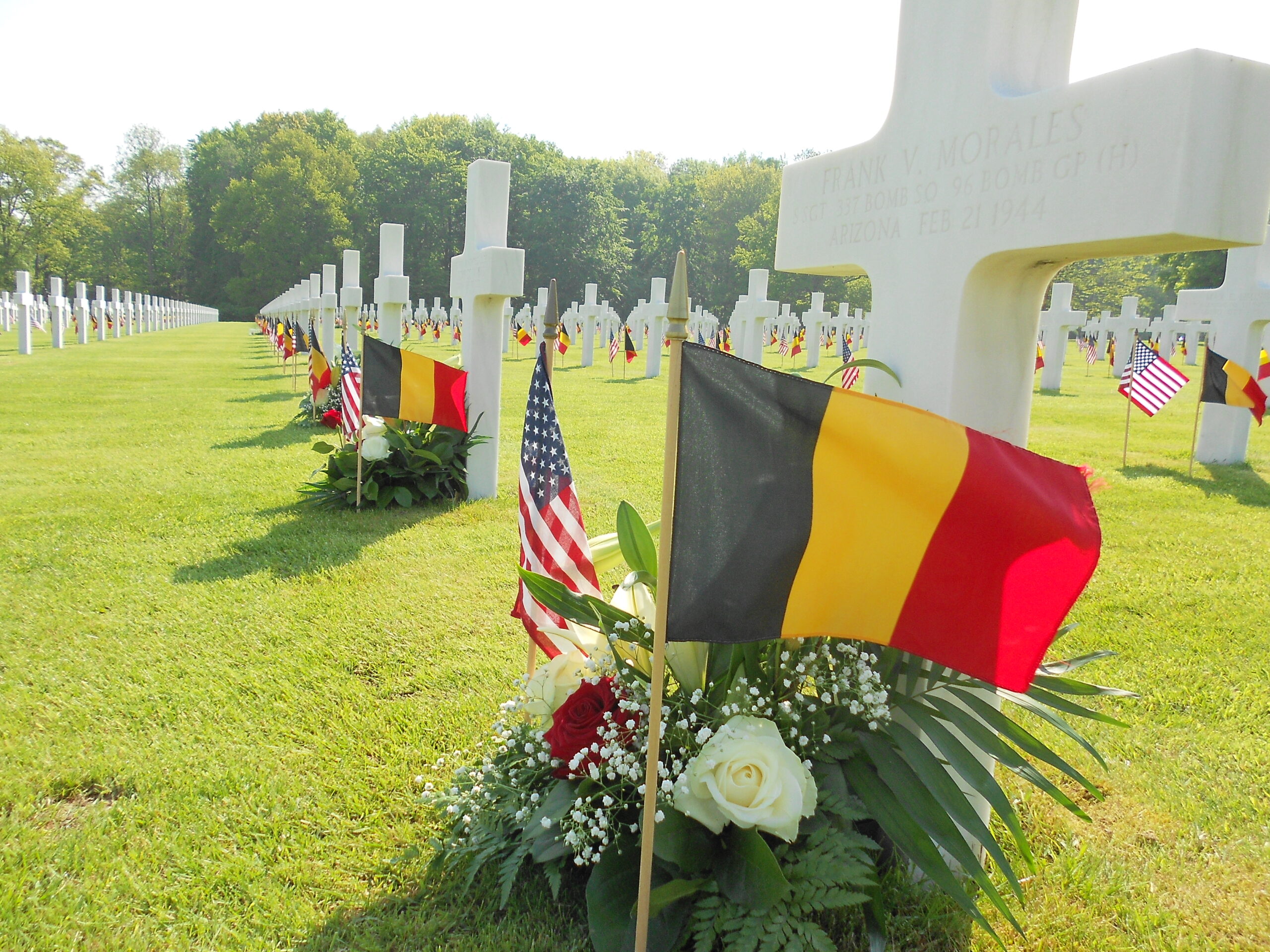 Flowers, and an American and Belgian flag rest at the base of a marble headstone.