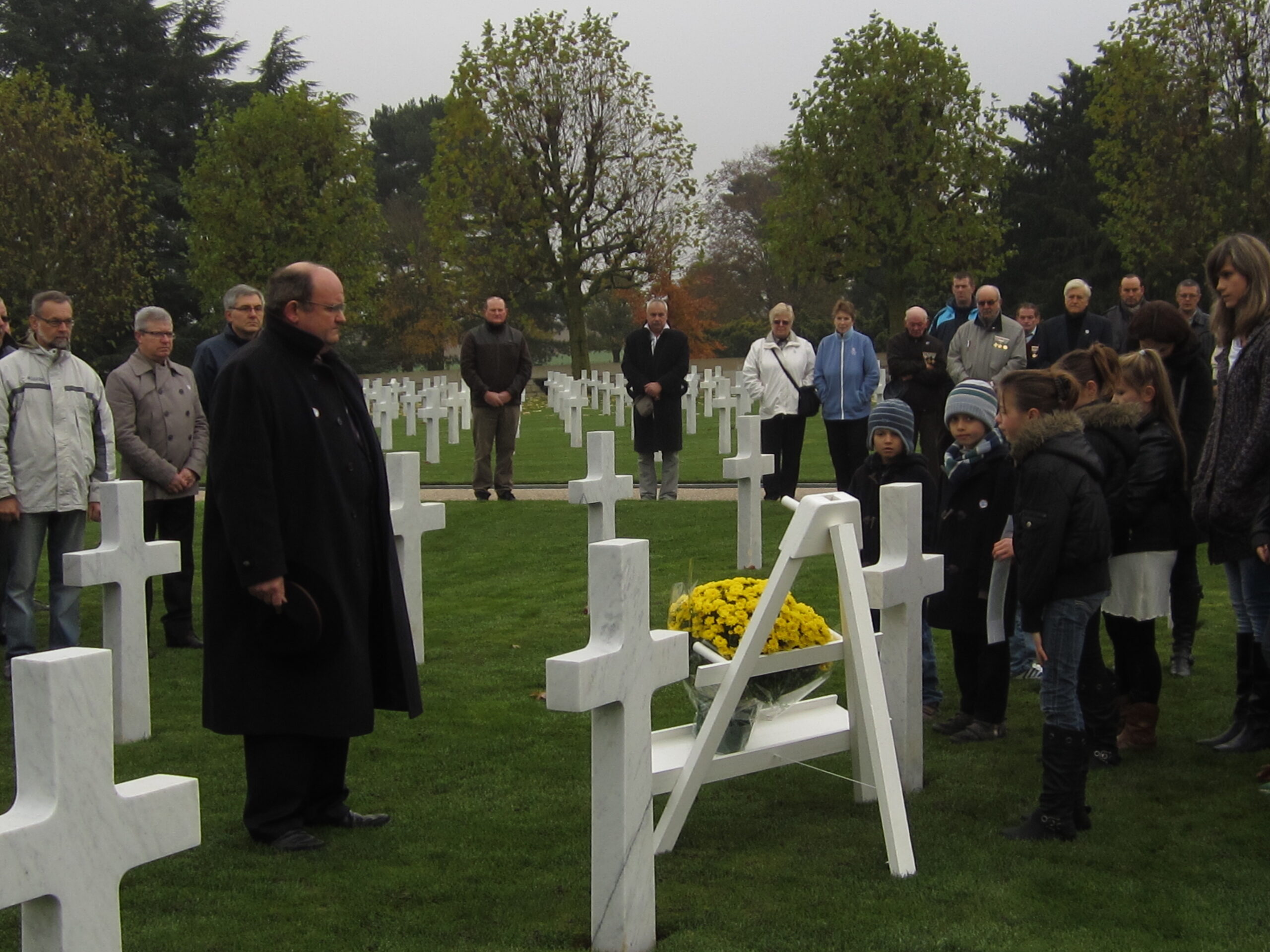 Flowers are laid at a headstone in Somme American Cemetery during the 2012 Veterans Day Ceremony.