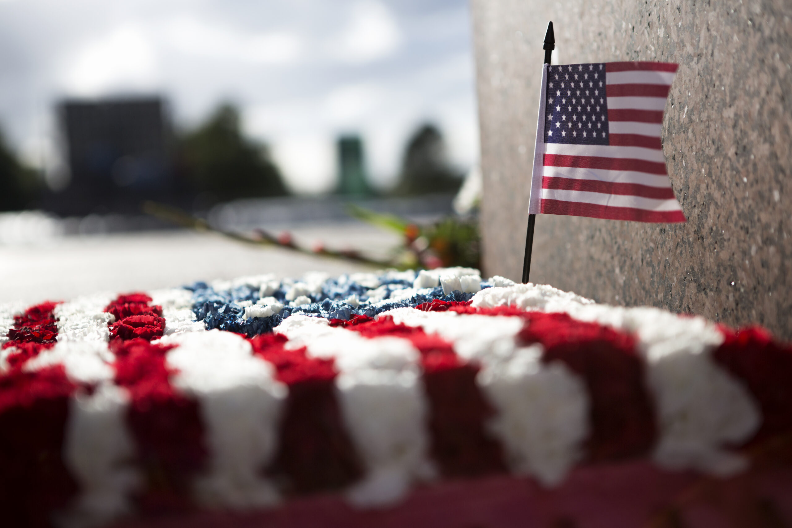 Flowers in the shape of an American flag rest at the base of the memorial.