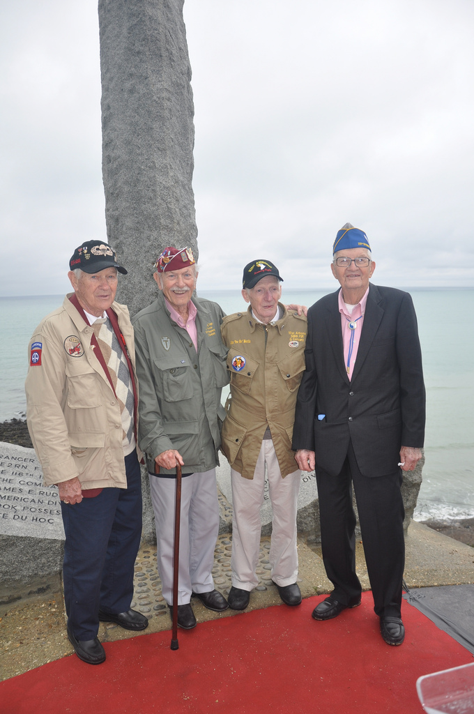 Four World War II veterans stand in front of the Ranger Monument at Pointe du Hoc.