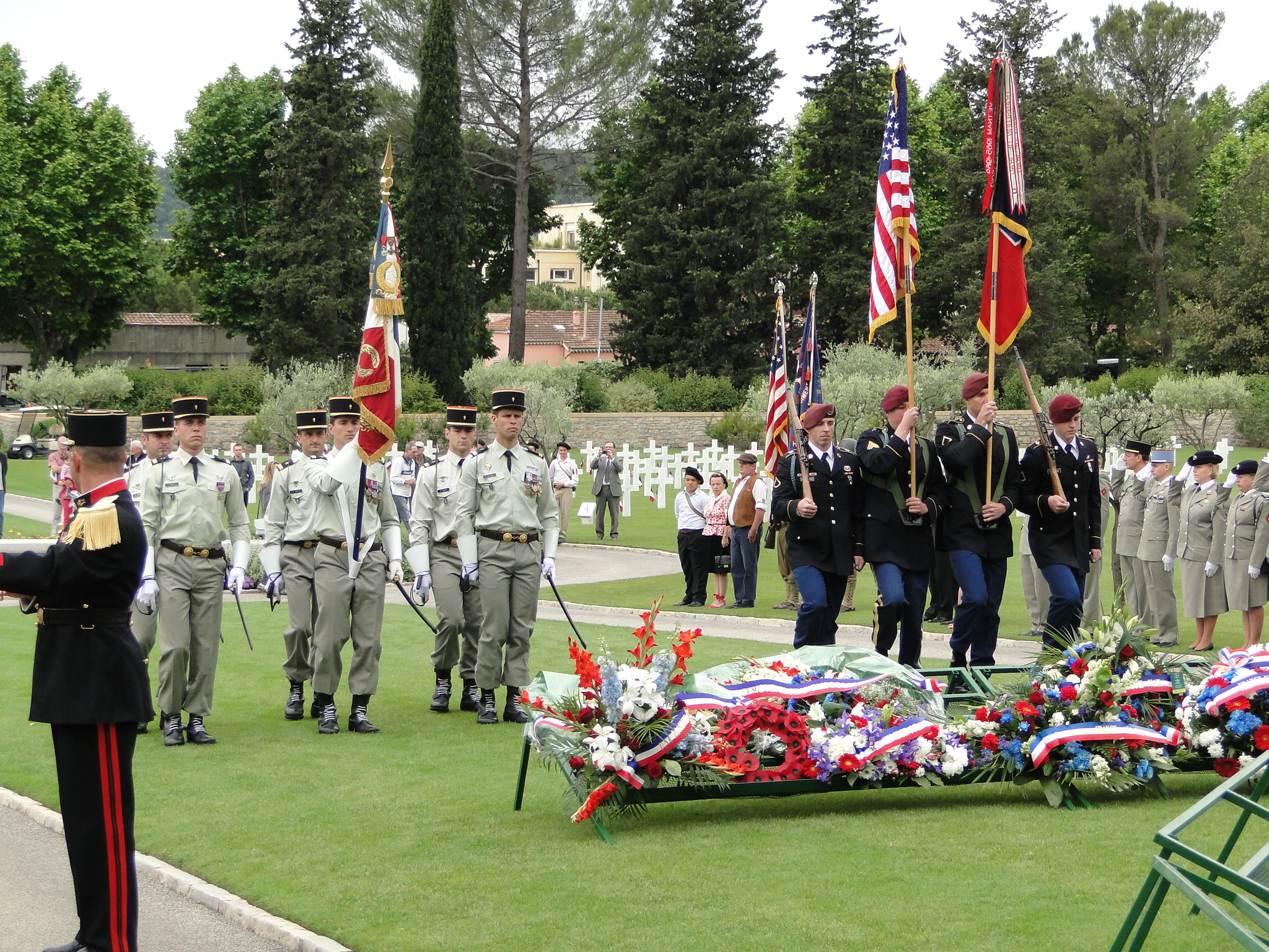 Members of the American and French military participate in the 2014 Memorial Day Ceremony at Rhone American Cemetery in France.