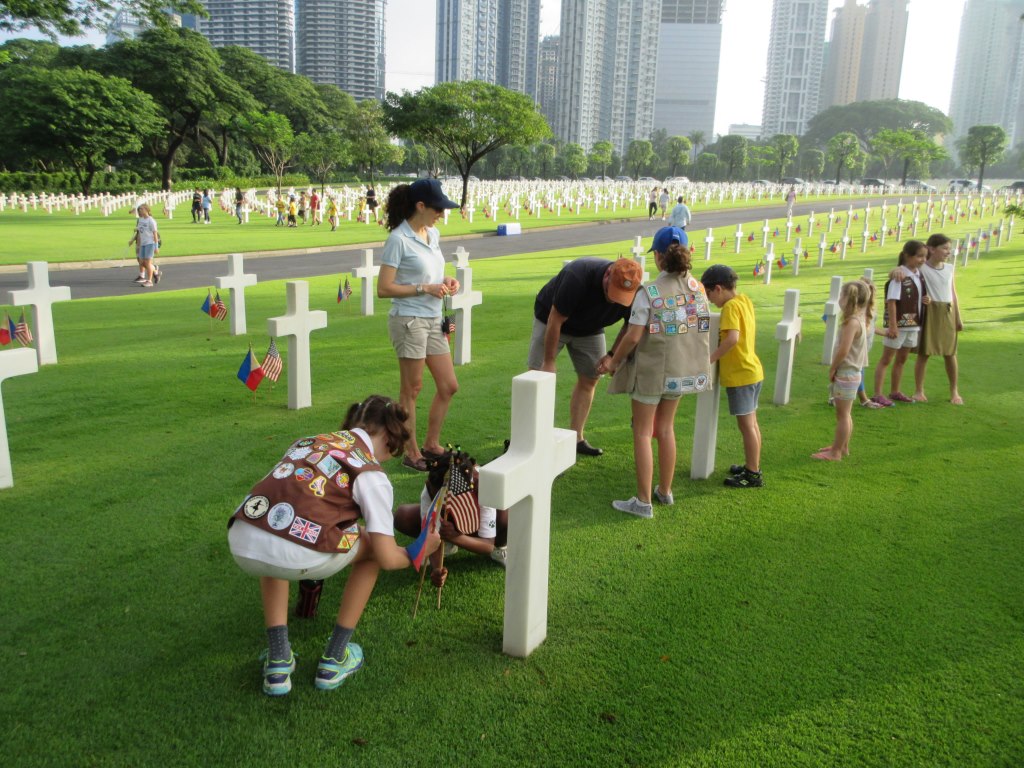 Girl Scouts help place American and Filipino flags at every headstone in preparation for the 2017 Memorial Day Ceremony at Manila American Cemetery.