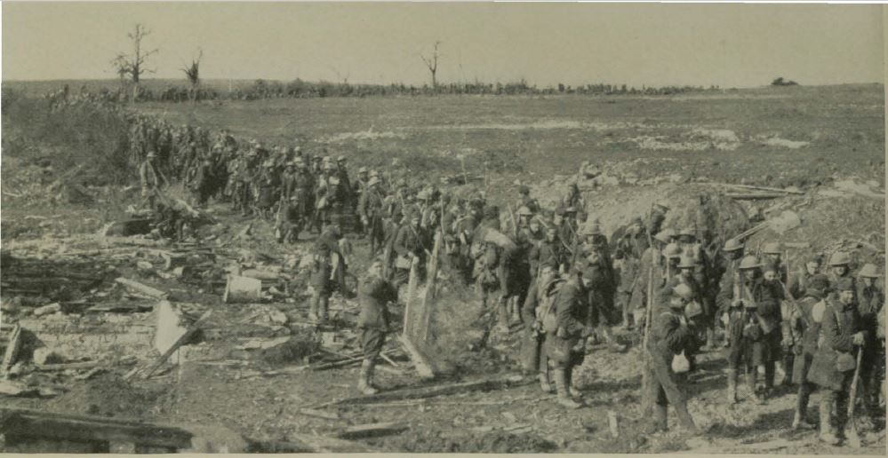 Historic image show soldiers marching through a devastated terrain.
