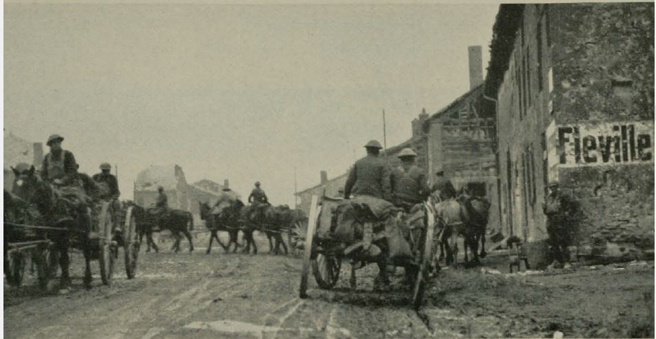 Historic image showing 1st division artillery in the streets of Fleville.