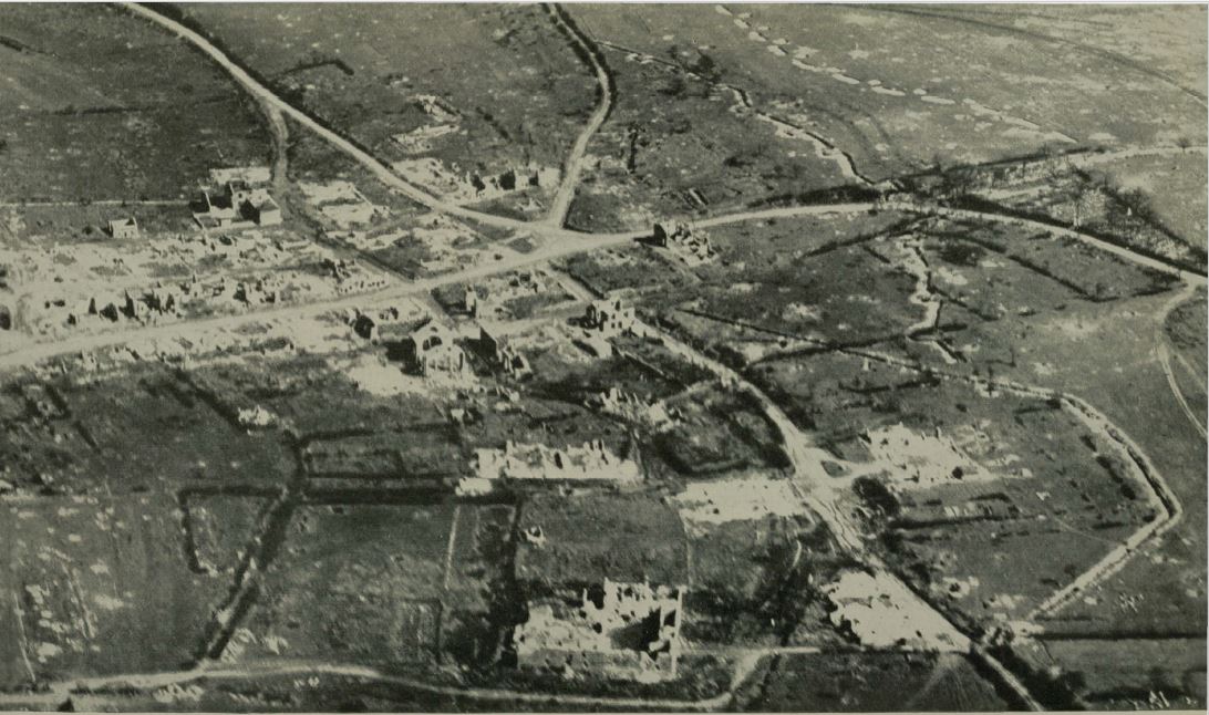 Historic image showing an aerial view of the ruins of Nantillois.