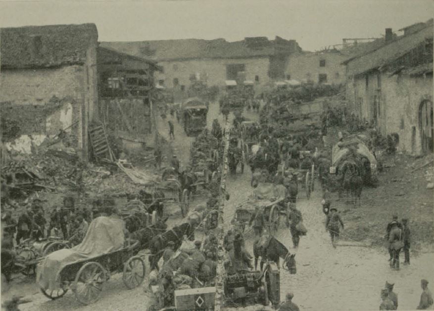 Historic image showing lines of troops and supplies pass through destroyed town.