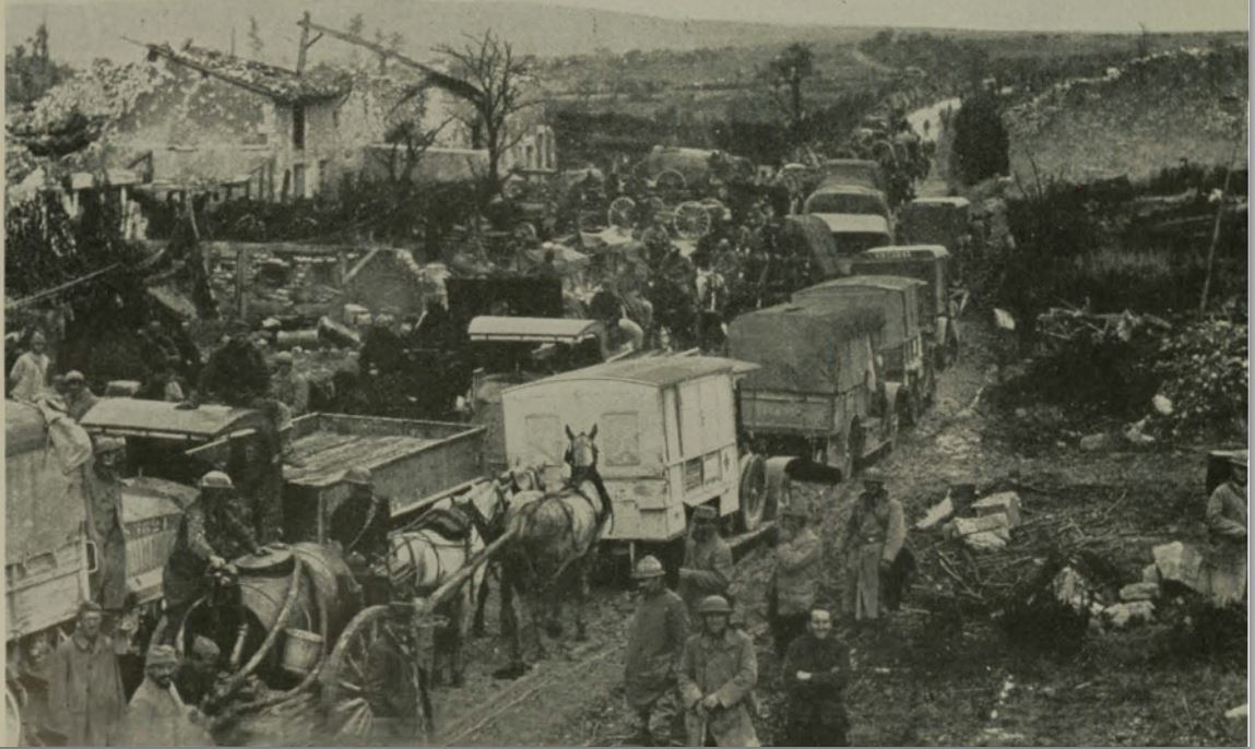 Historic image showing the crowded road of Esnes.
