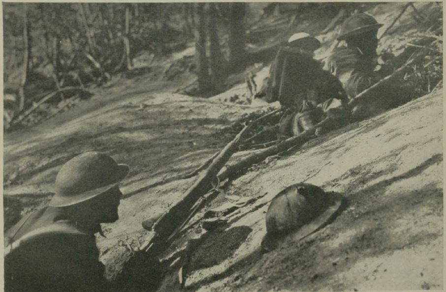 Historic image showing troops in fox holes.