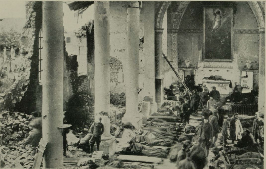Historic image showing wounded in a bombed out church.