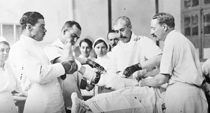 Historic images shows doctors working on a patient.