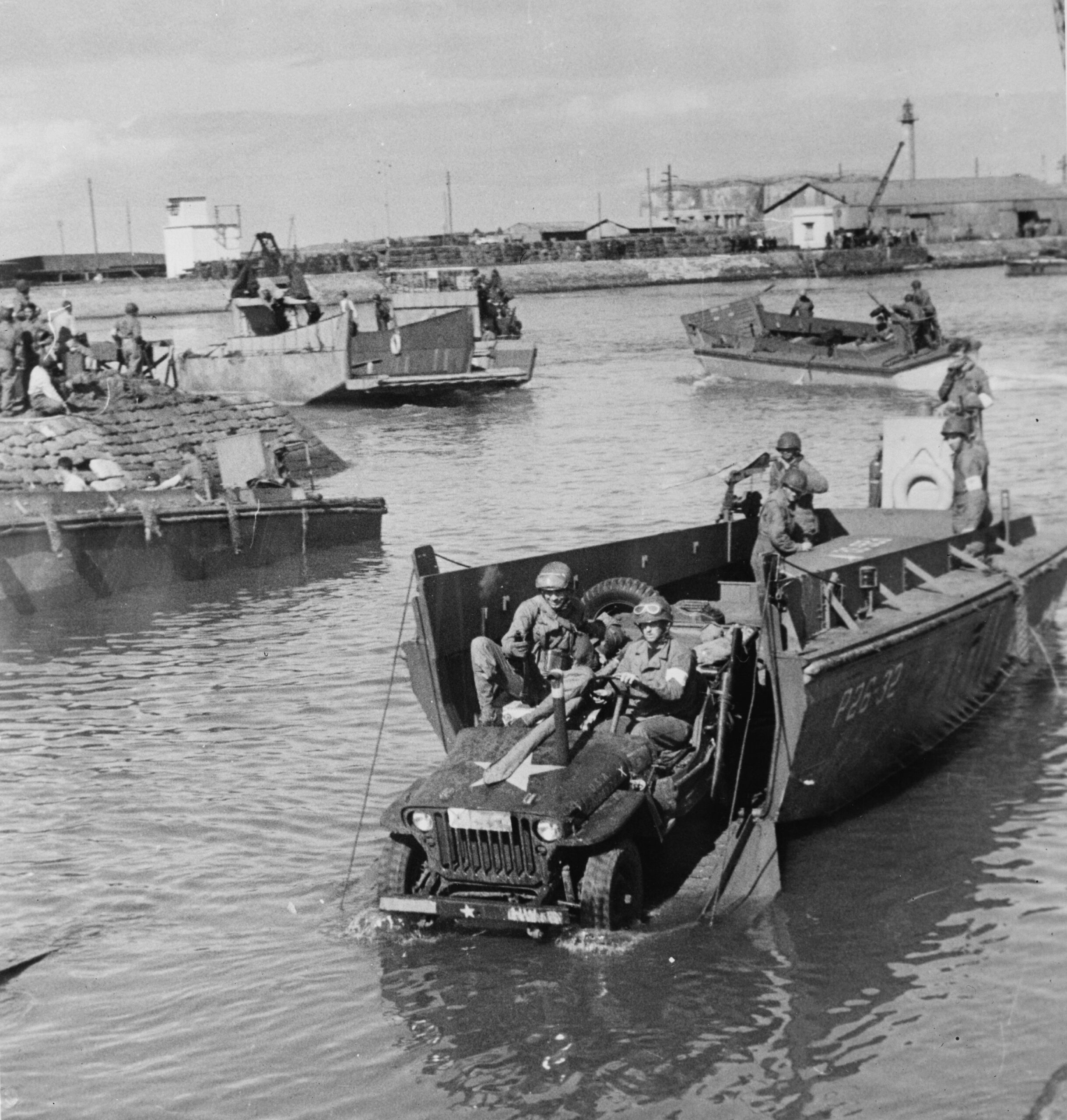 A jeep rolls off a landing boat at Fedala harbor in Morocco during the landing operations of the U.S. task forces there during Operation Torch. Image courtesy of the Library of Congress (LC-USW33- 000798-ZC [P&P]).