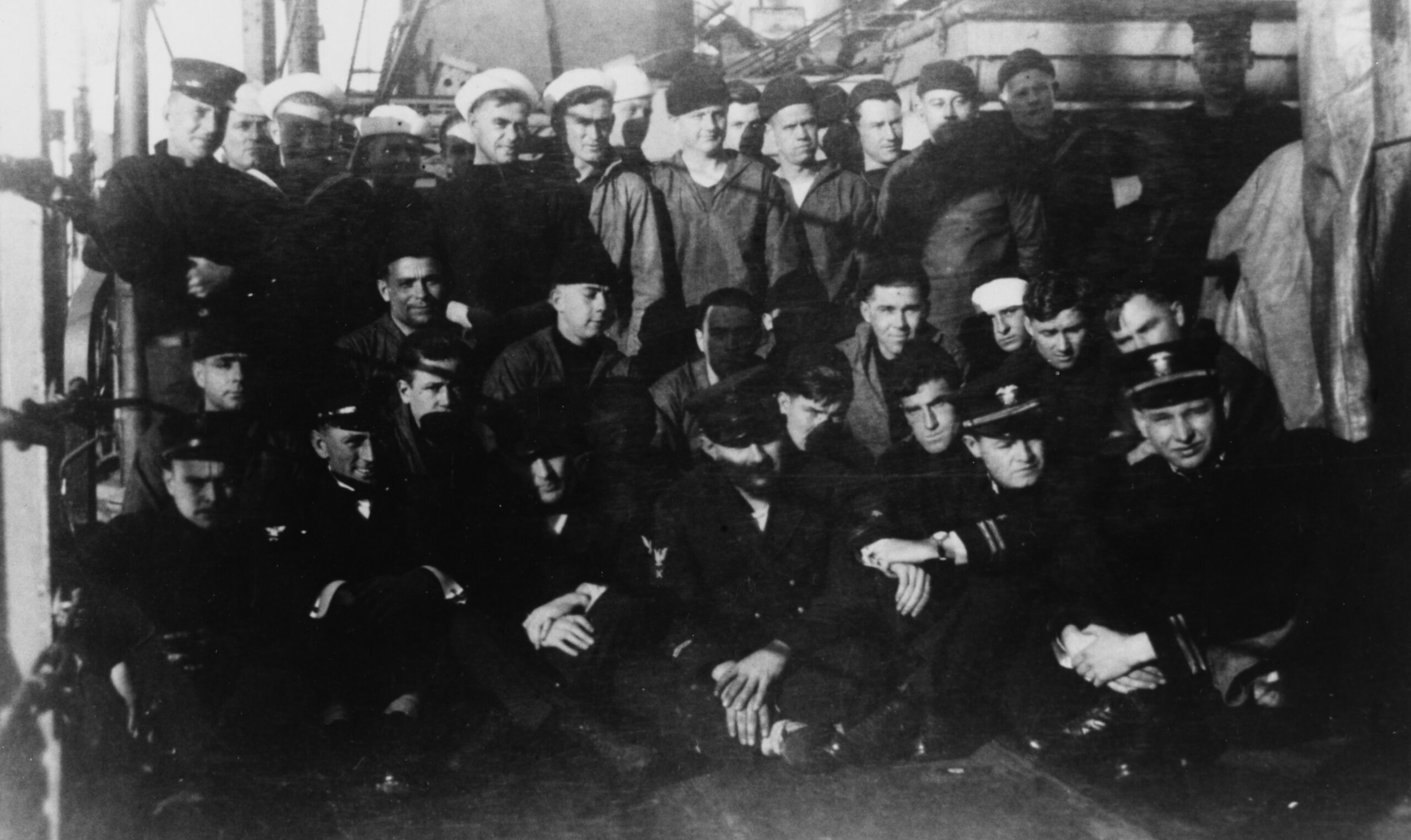 Historic photo shows men on the deck of a ship.