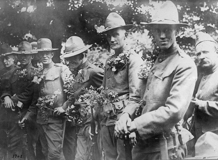 Historic photo shows soldiers in uniform with flowers.