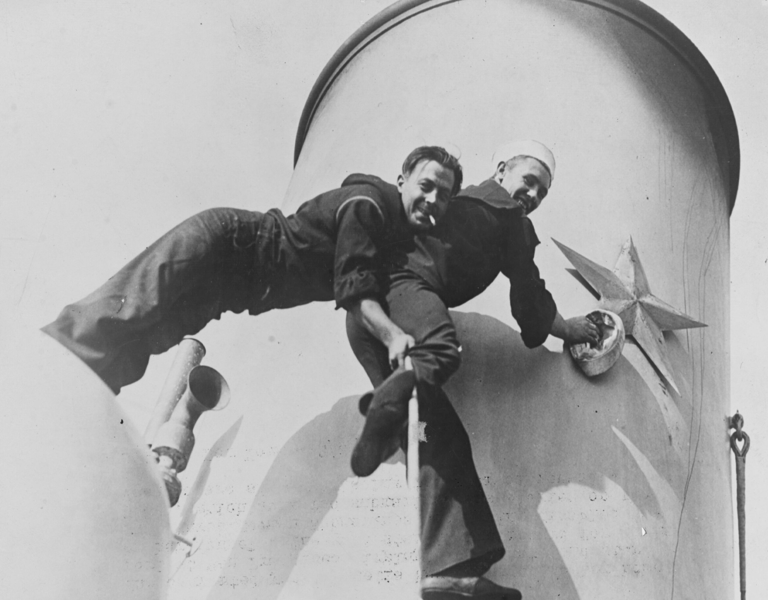 Historic photo shows two men smiling while working on the smokestack.