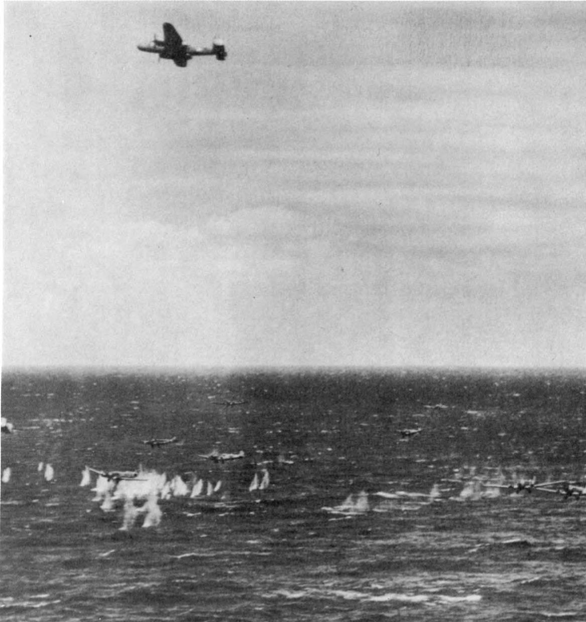 Allied aircraft fire on German transport planes over the Mediterranean in April 1943.