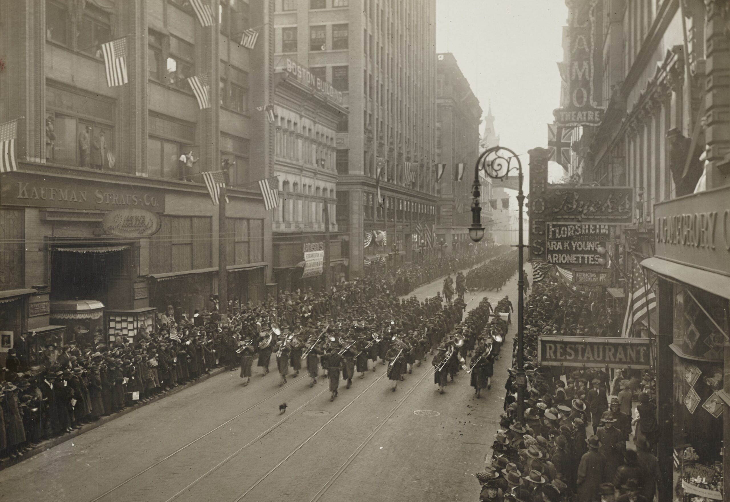 Historic photos shows men in uniform parading down city street.