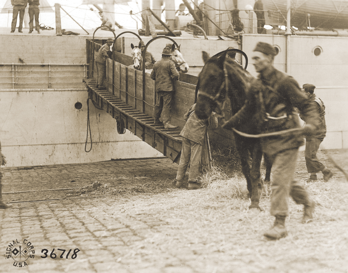 Horses debark from a transport ship at Bordeaux. Almost 68,000 horses and mules were shipped from the United States to the AEF.
