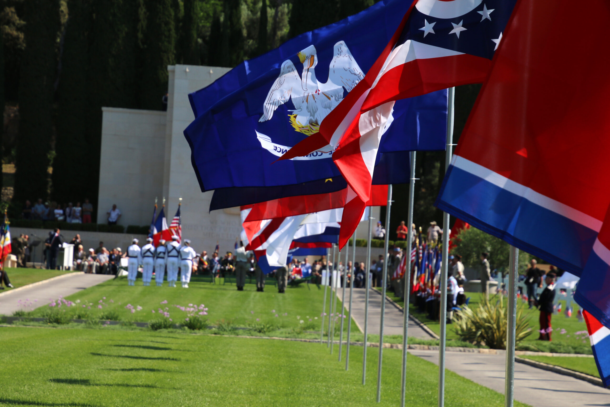 Flags line the mall area during the 2017 Memorial Day Ceremony at Rhone American Cemetery. Image courtesy of Michael Delanoy.