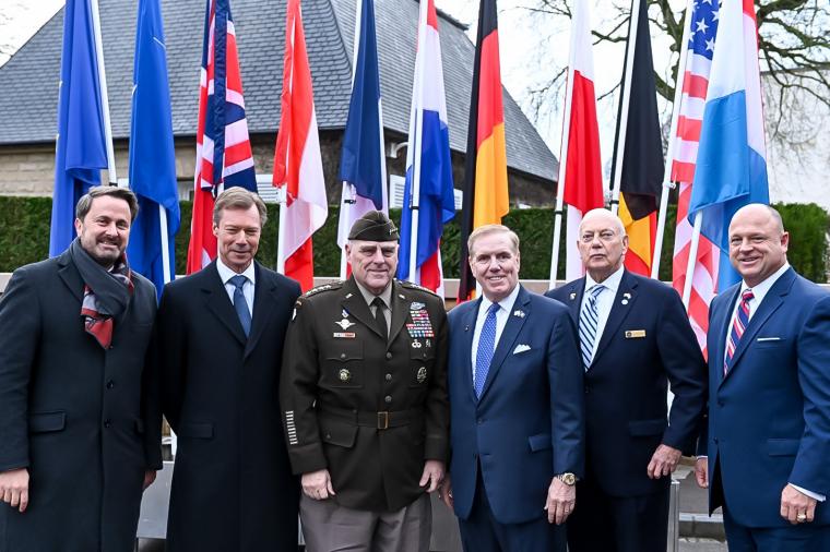 Leaders from the U.S., Luxembourg, Belgium, Poland and Germany were amongst the official delegations that attended the Battle of the Bulge 75th Anniversary ceremony. From left to right: Prime Minister of Luxembourg Xavier Bettel; His Royal Highness the Grand Duke Henri of Luxembourg; Chairman of the Joint Chiefs of Staff Gen. Mark Milley; U.S. Ambassador to Luxembourg Randy Evans; Secretary of the American Battle Monuments Commission (ABMC) William Matz; and Chairman of ABMC David Urban.