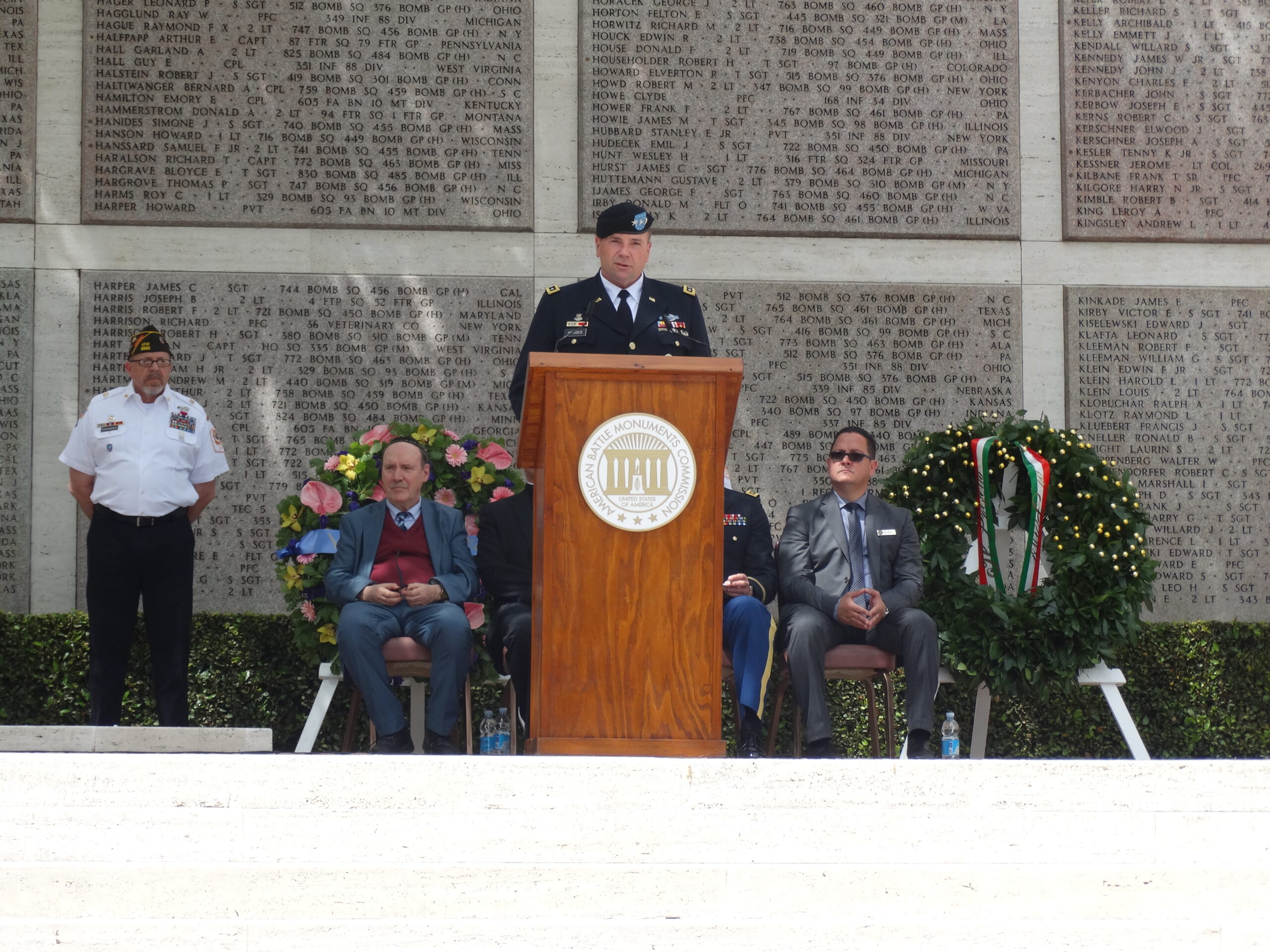 Lt. Gen. Hodges speaks from a podium in front of the Tablets of the Missing.
