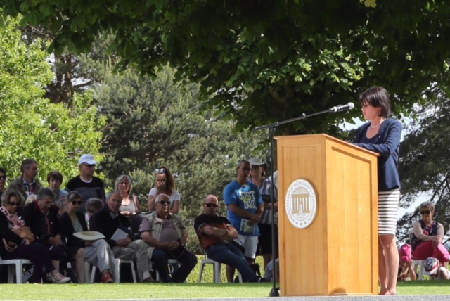 Mayor of Saint-James Carine Mahieu delivered remarks during the 2018 Memorial Day Ceremony at Brittany American Cemetery. Image courtesy of Bernard Guénée.