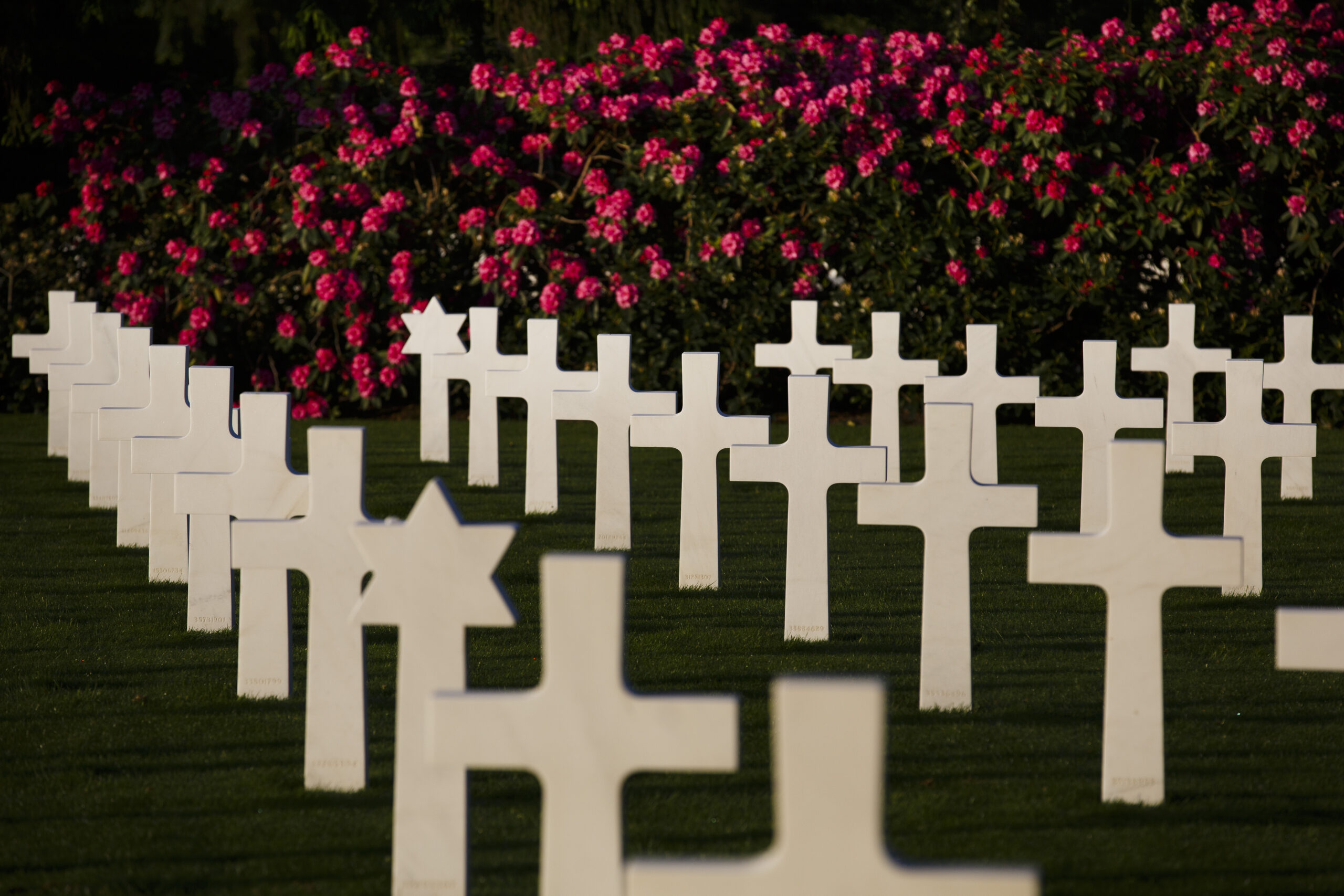 Marble headstones are perfectly aligned near flowering bushes.