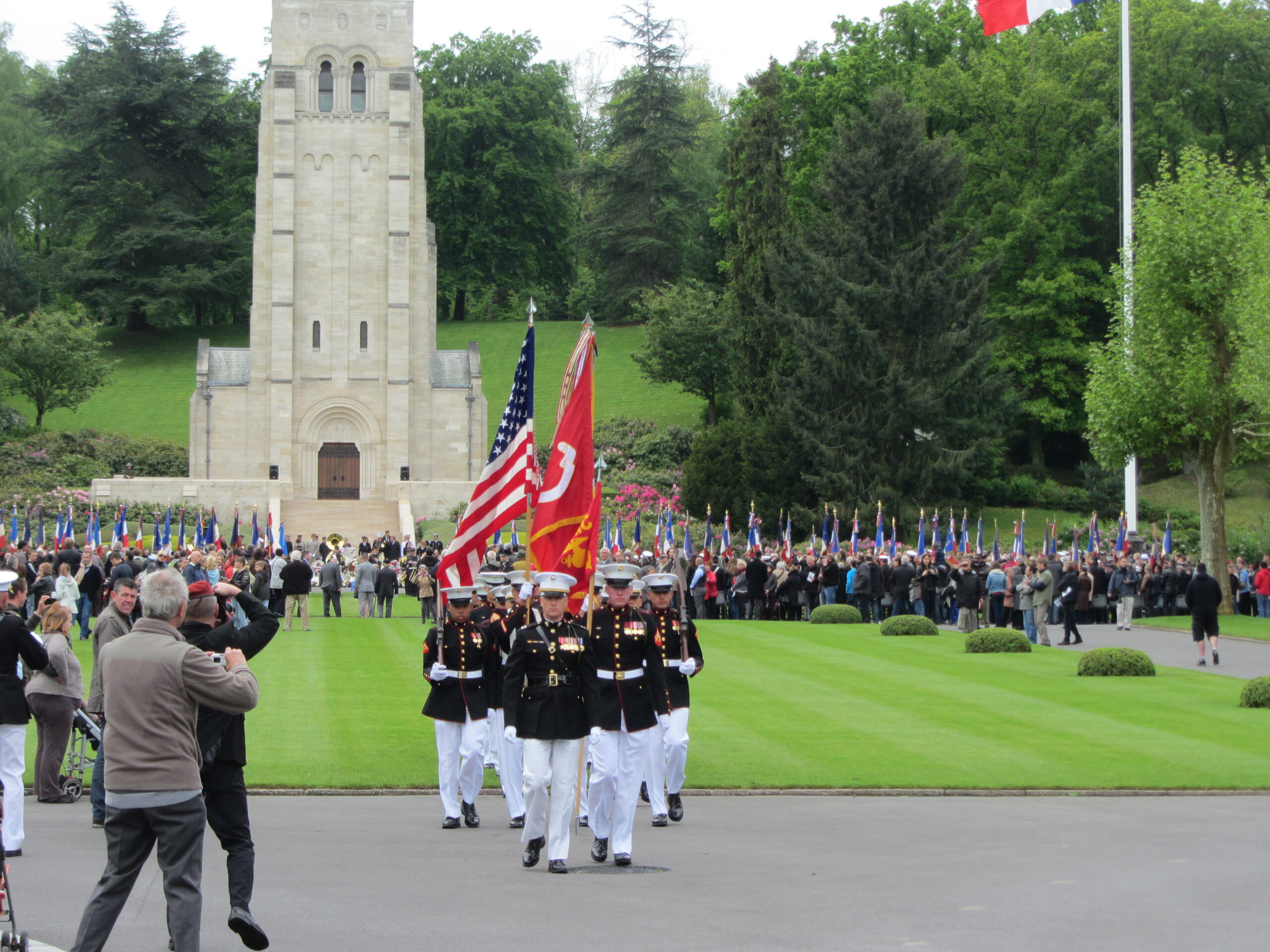 Members of the U.S. Marine Corps march during the 2013 Memorial Day ceremony at Aisne-Marne American Cemetery.