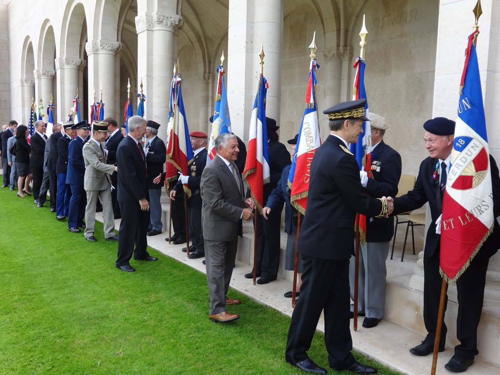 The official party thanks the French Porte Drapeau after the 2015 Memorial Day Ceremony at Meuse-Argonne American Cemetery.