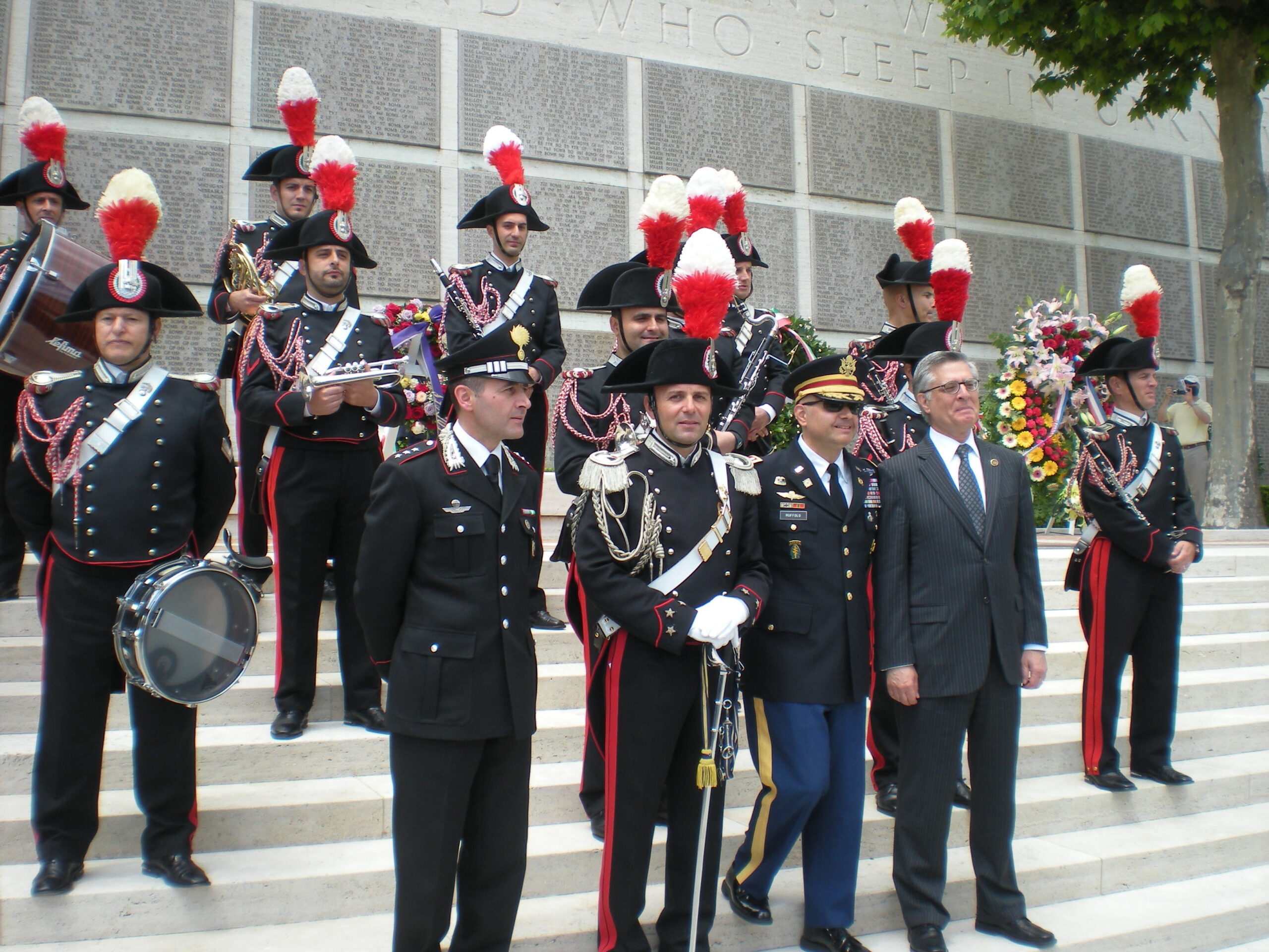 Members of the Italian military stand on steps in front of the Wall of the Missing.
