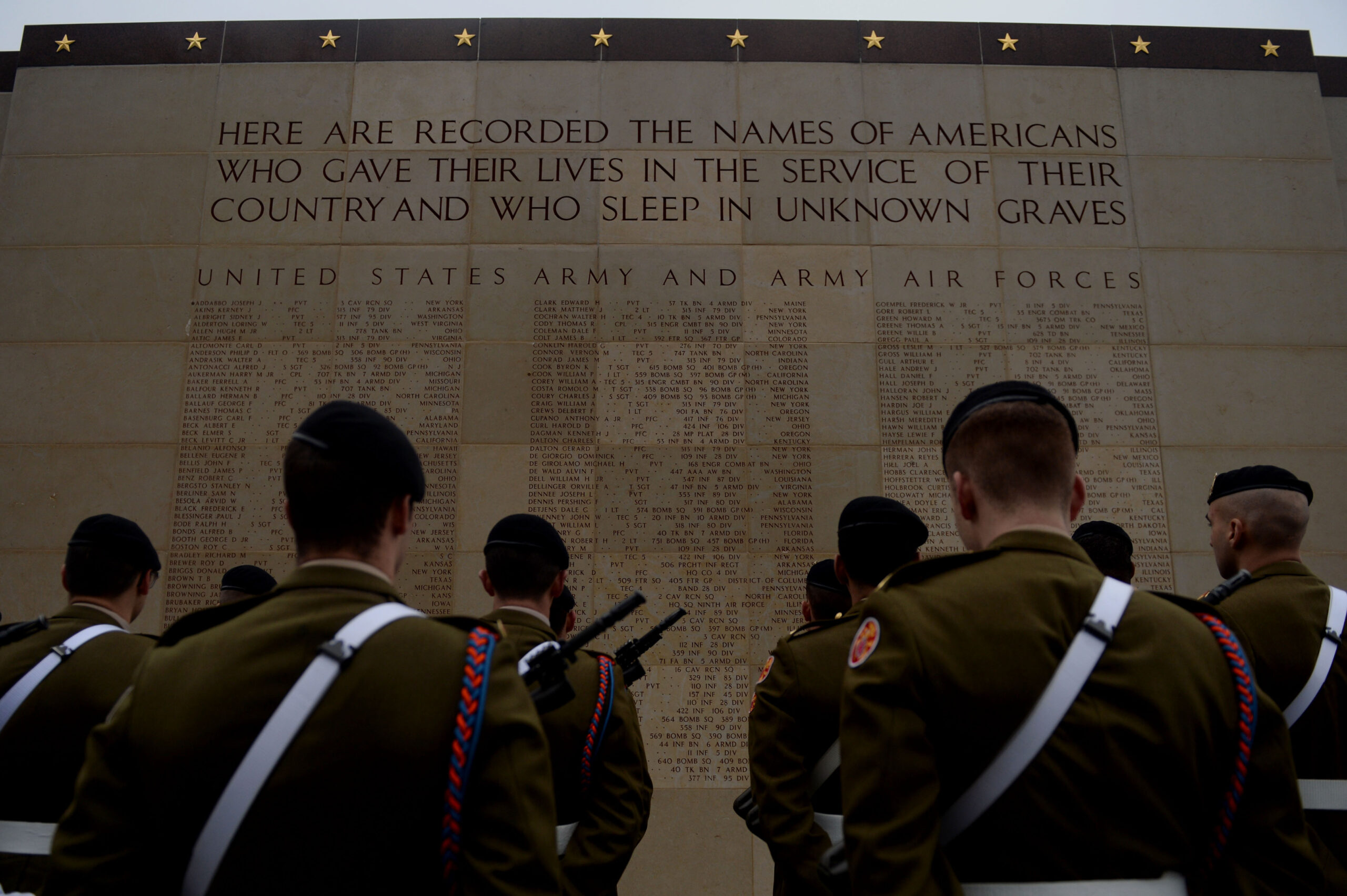 Members of the Luxembourg military face the Wall of the Missing at the cemetery.