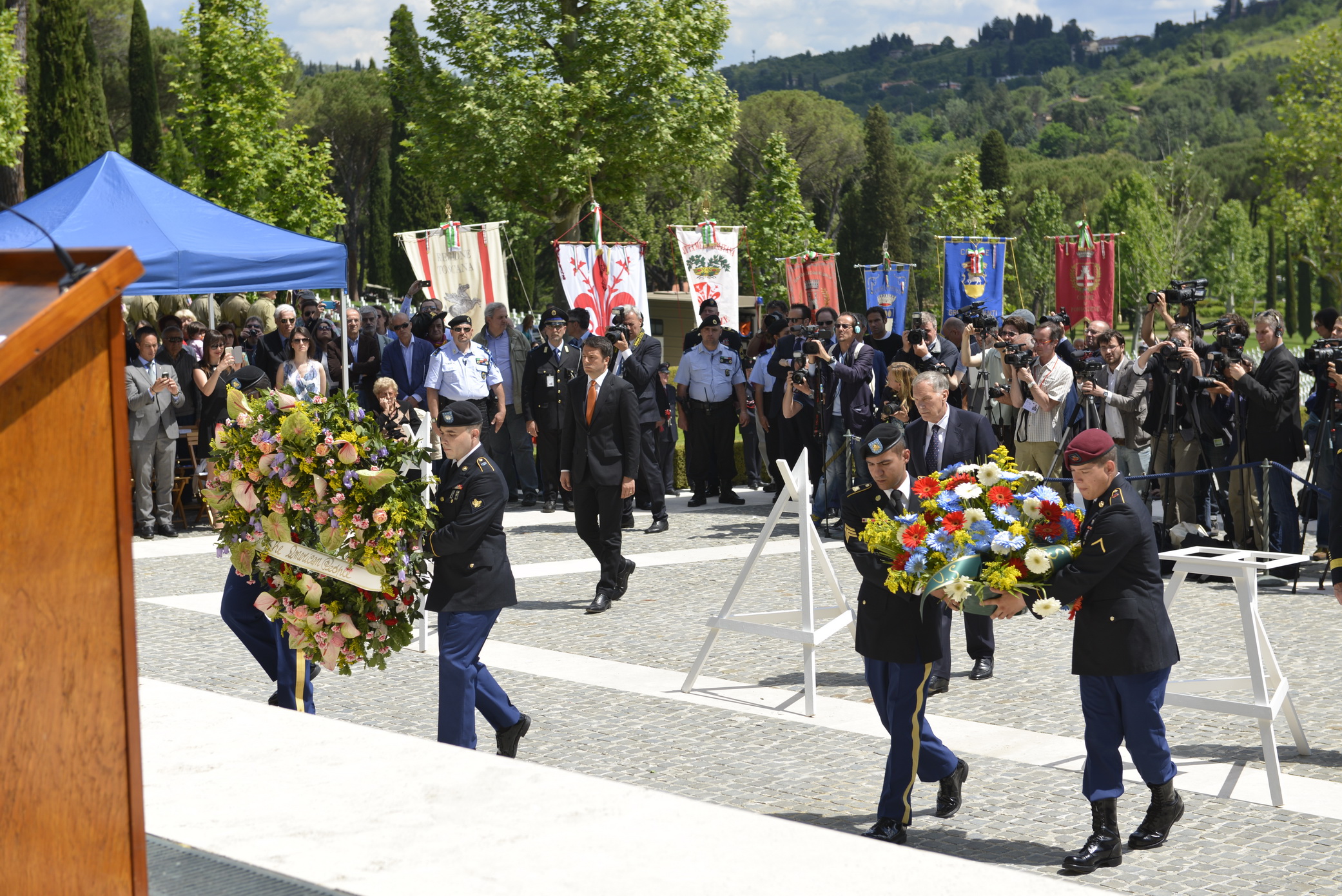 Multiple wreaths were laid during the 2015 Memorial Day Ceremony at Florence American Cemetery. Image courtesy of the U.S. Embassy to Italy.