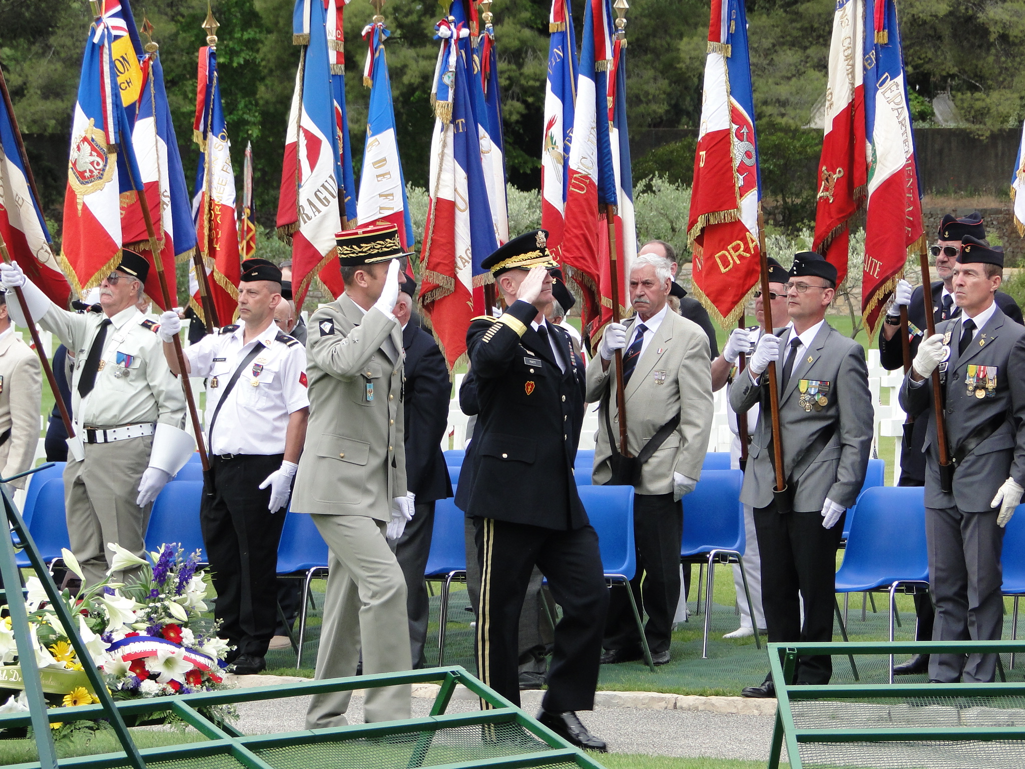 Members of the military salute while marching in the 2014 Memorial Day Ceremony at Rhone American Cemetery in France.