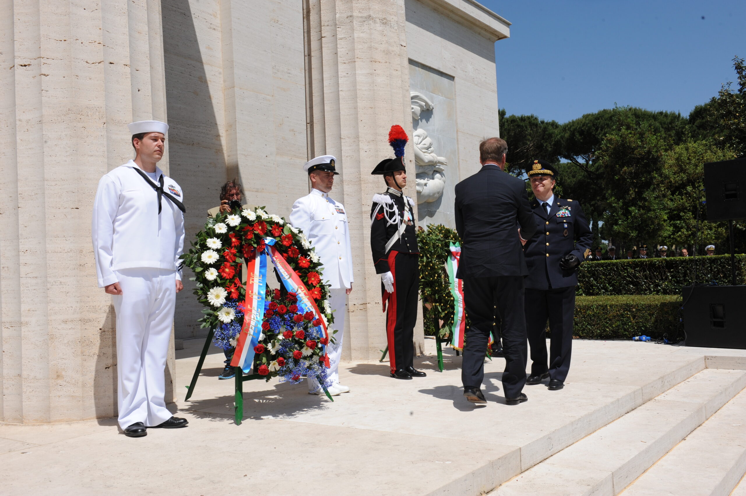 Members of the American military and Italian military stand next to floral wreaths during the 2014 Memorial Day Ceremony at Sicily-Rome American Cemetery.