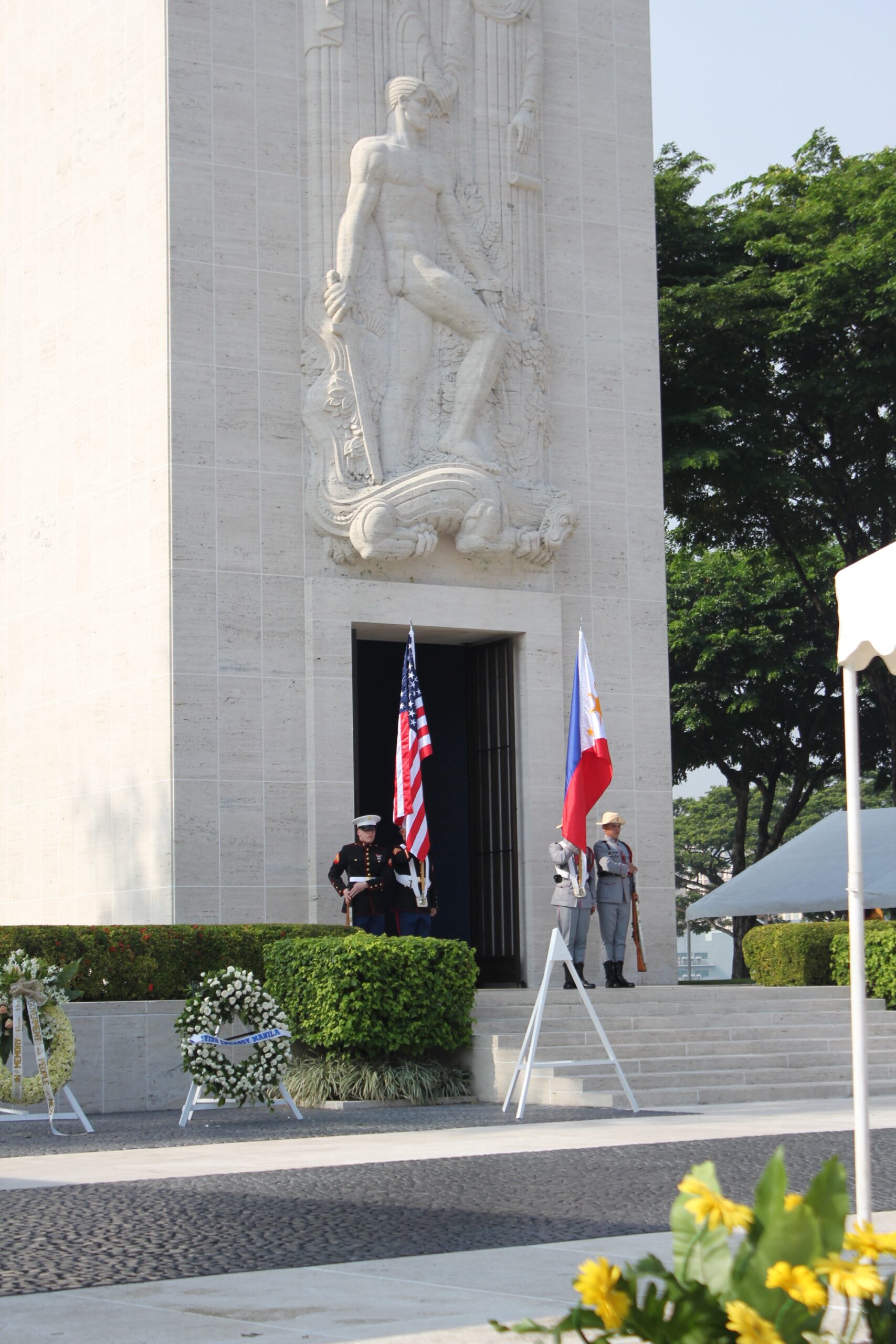 Members of the military from both the United States and the Philippines stand in front of the chapel at Manila American Cemetery during the 2013 Memorial Day ceremony.