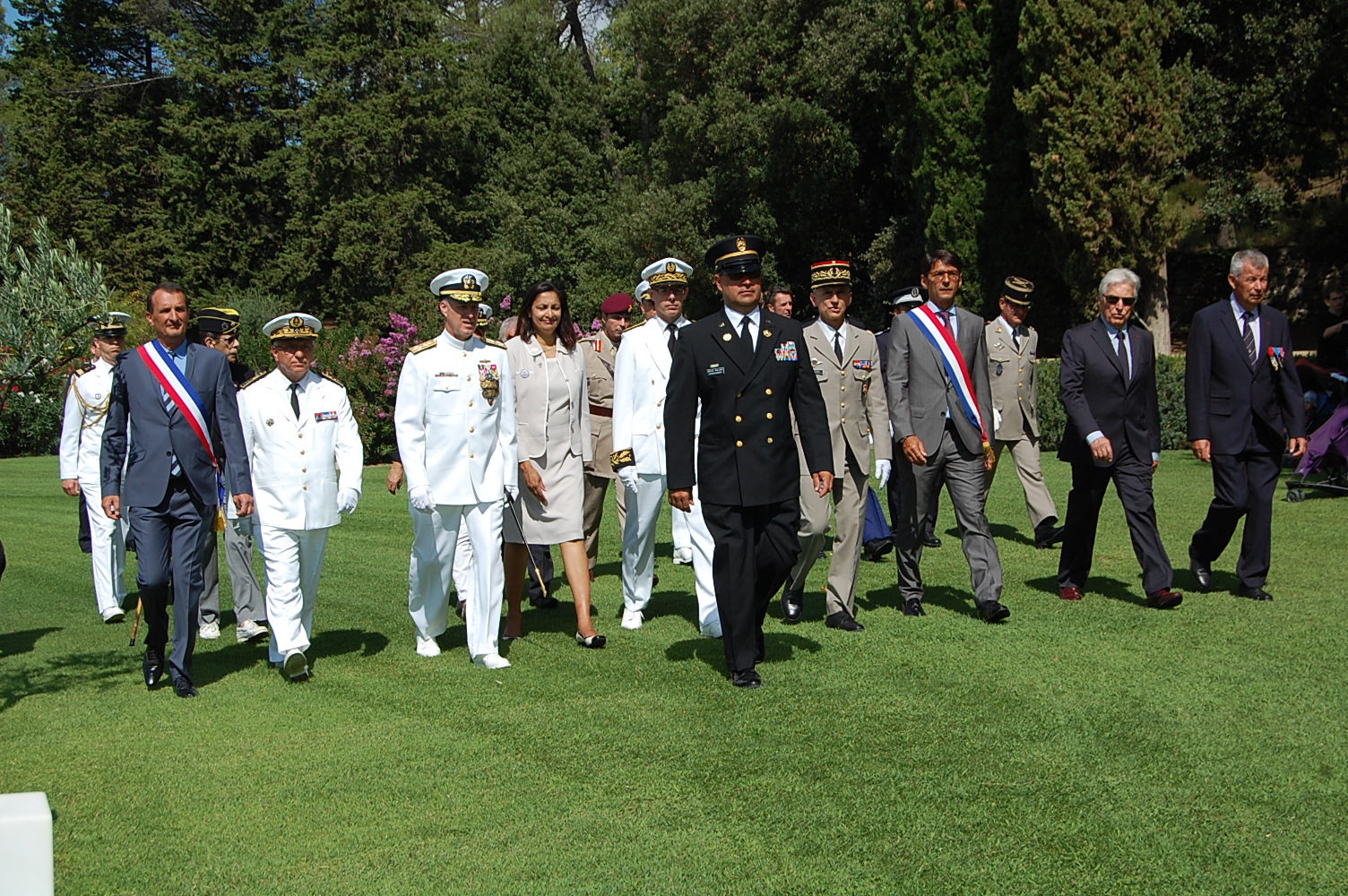 Members of the official party arrive for the 70th anniversary ceremony at Rhone American Cemetery