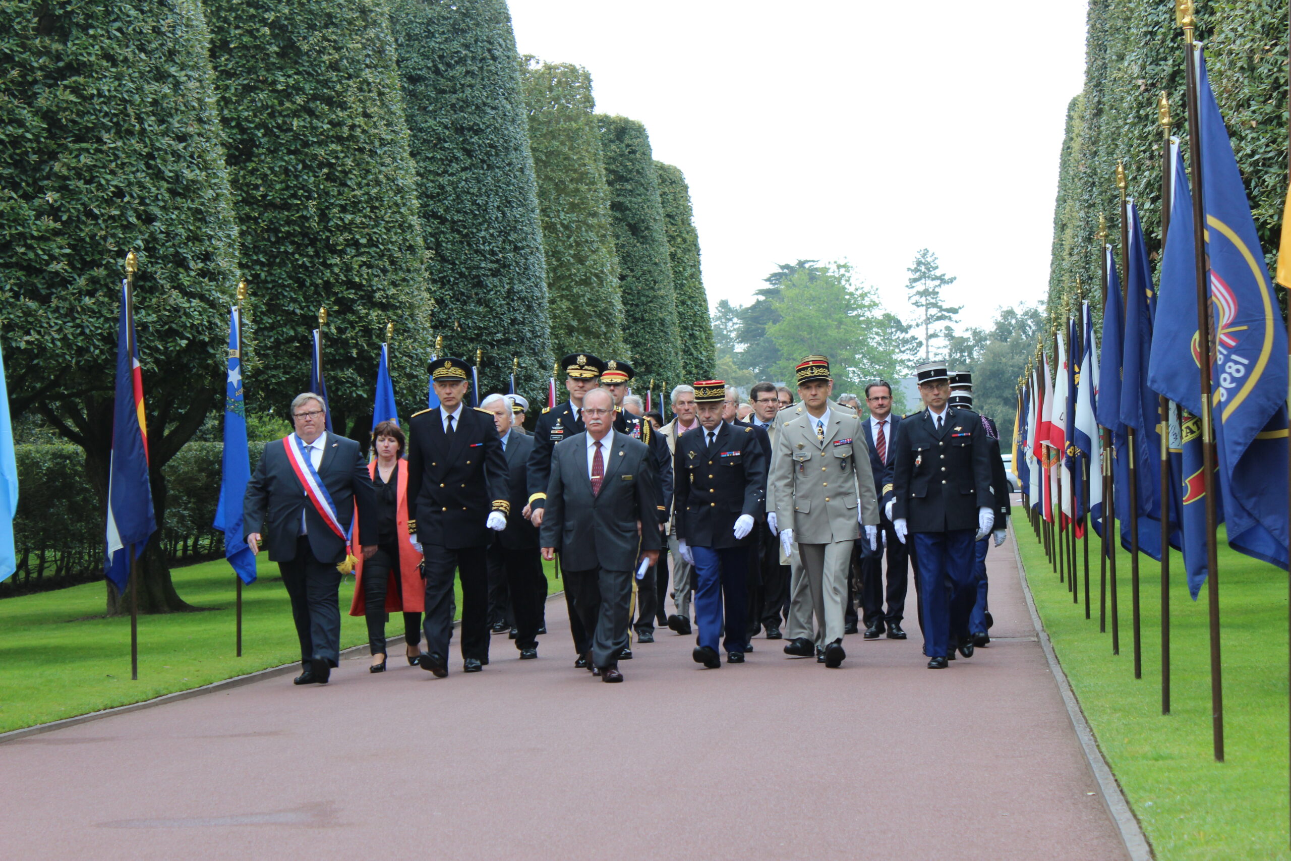 Members of the official party walk down a flag-lined pathway in the cemetery.