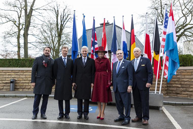Members of the U.S., Luxembourg, and Belgian official delegations arrive at the Battle of the Bulge 75th Anniversary ceremony. From left to right: Prime Minister of Luxembourg Xavier Bettel; His Royal Highness the Grand Duke Henri of Luxembourg; King Phillipe and Queen Mathilde of Belgium; U.S. Ambassador to Luxembourg Randy Evans; and Secretary of the American Battle Monuments Commission William Matz.