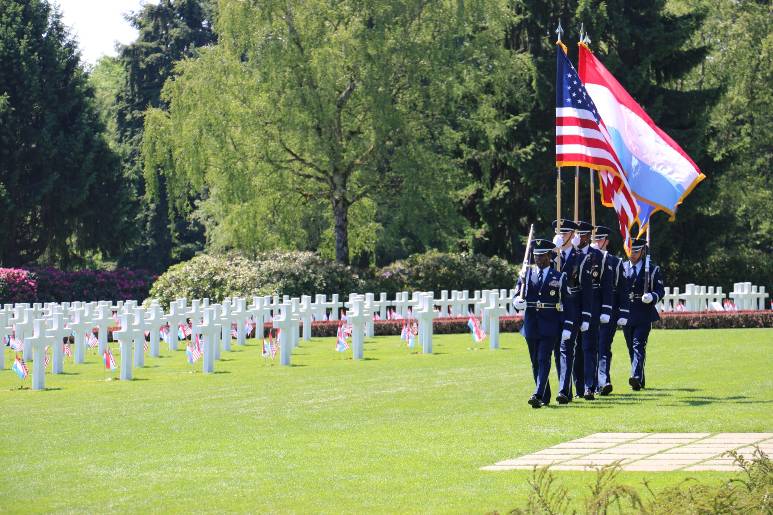 Members of the 52nd Fighter Wing serve as an Honor Guard during the 2017 Memorial Day Ceremony at Luxembourg American Cemetery. Image courtesy of U.S. Embassy Luxembourg.