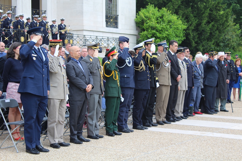 Military representatives stand and salute during the 2016 Memorial Day Ceremony at Suresnes American Cemetery. Image courtesy of Emily Munsel.