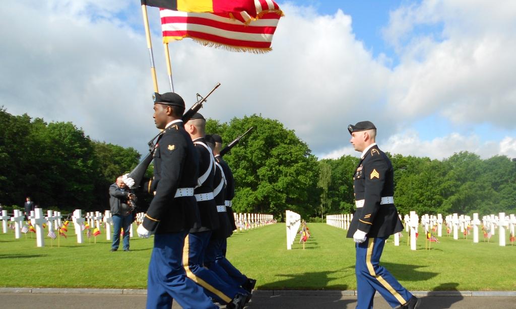 A U.S. Honor Guard marches during the 2014 Memorial Day ceremony at Ardennes American Cemetery in Belgium.