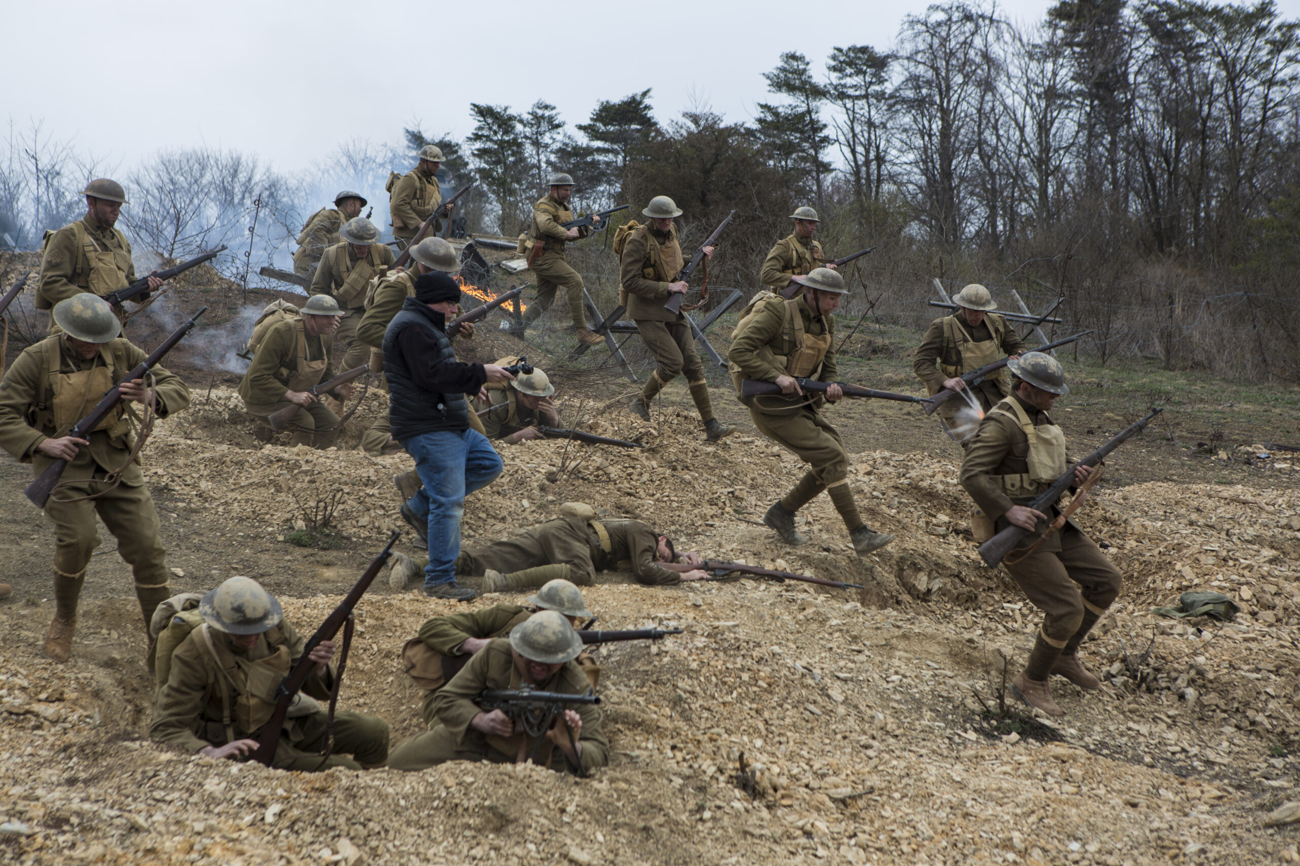 Men in WWI uniforms charge down a hill.