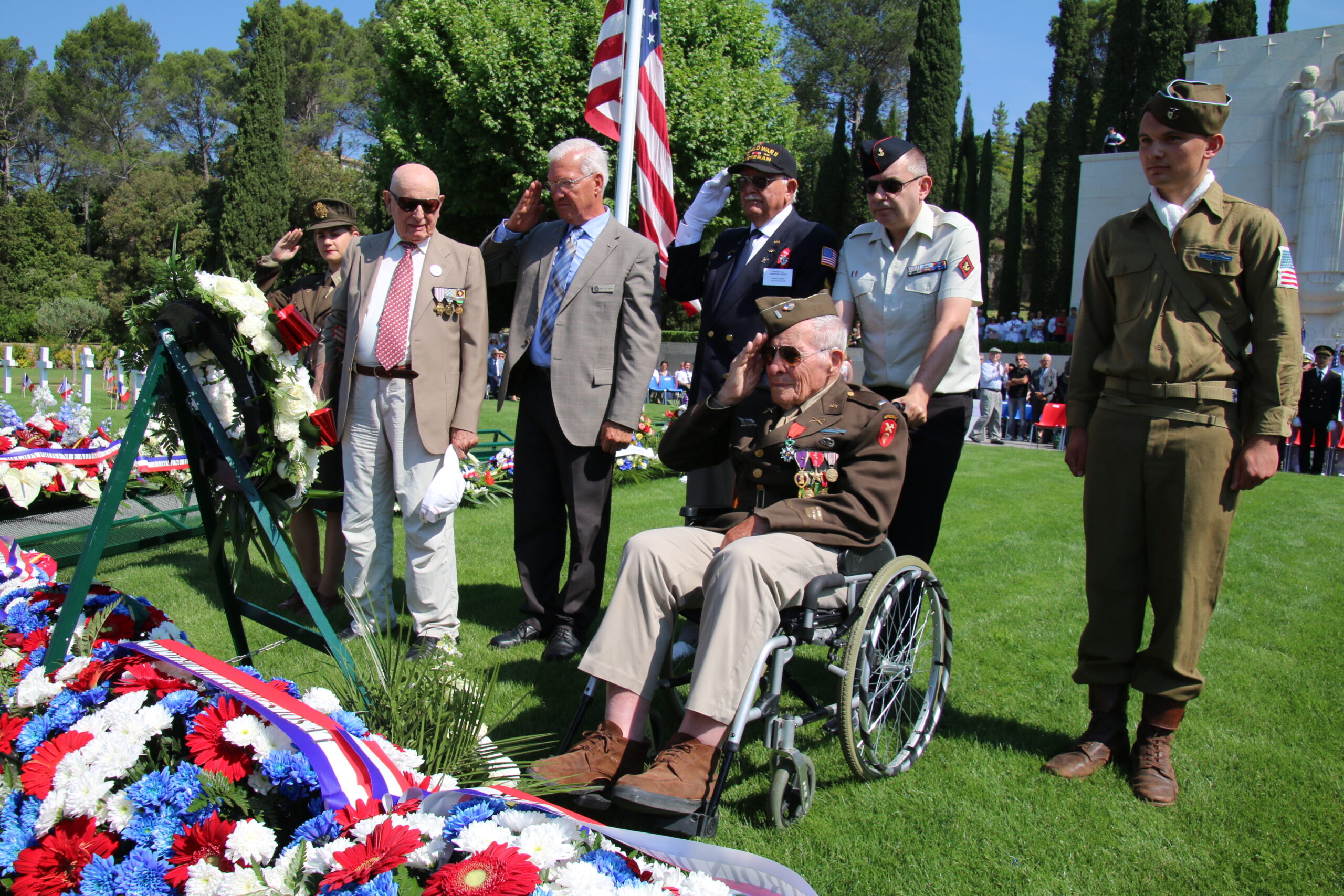 Veterans assist with presenting the floral wreaths during the 2017 Memorial Day Ceremony at Rhone American Cemetery. Image courtesy of Michael Delanoy.